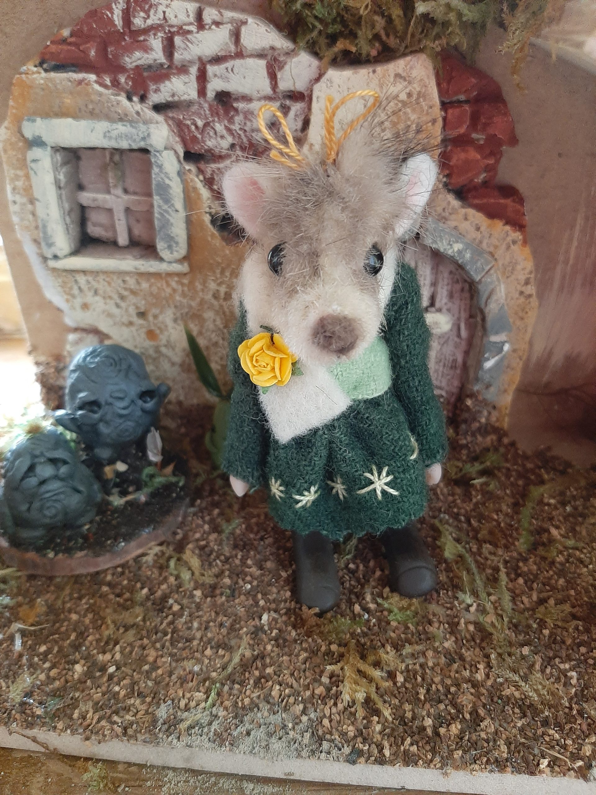 She is handmade using various materials including polymer clay and faux fur. Her clothes are sewn on and are not removable.