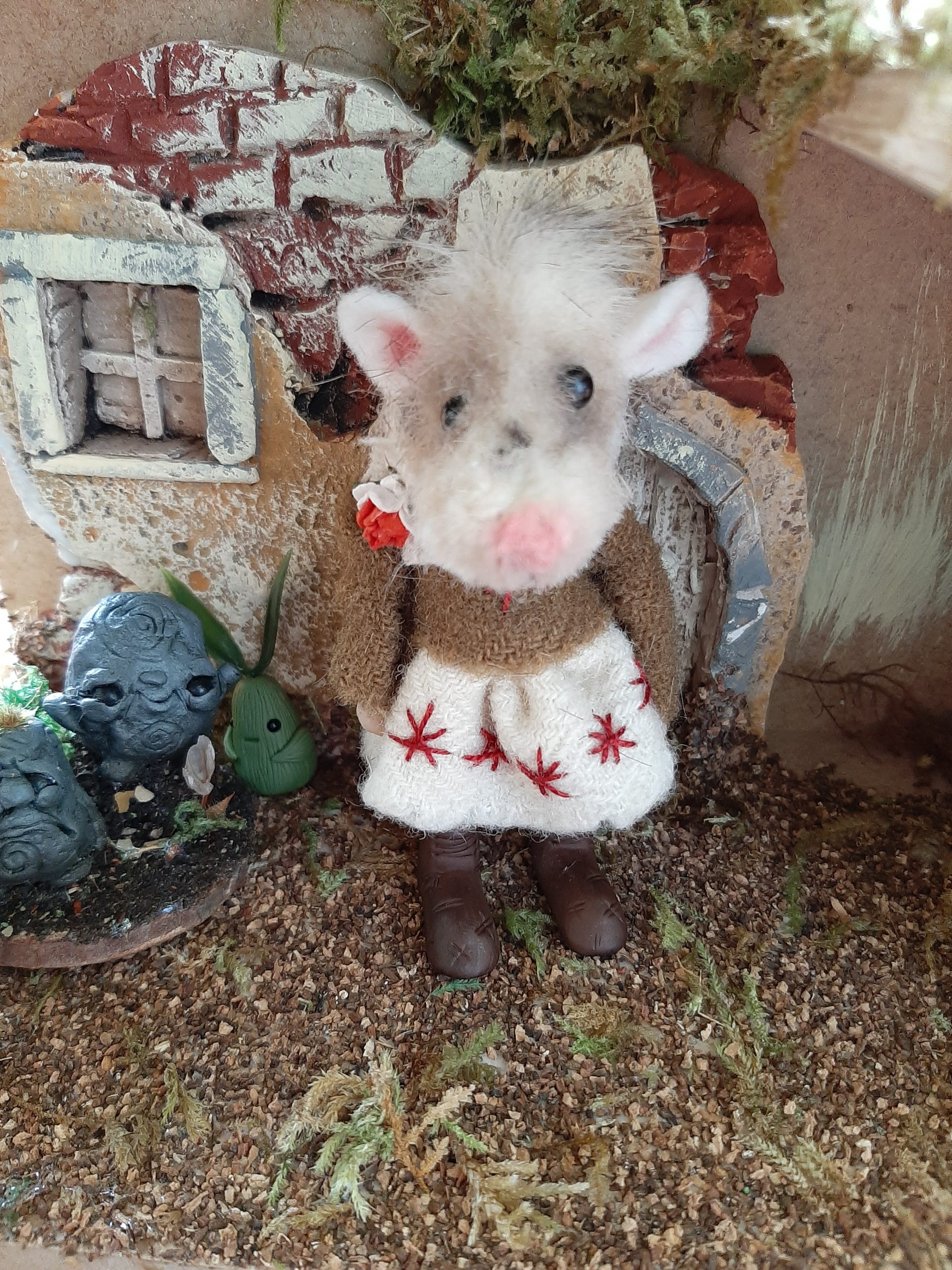 Emily-Rose is made from various materials including polymer clay and faux fur and is wearing fixed clothes