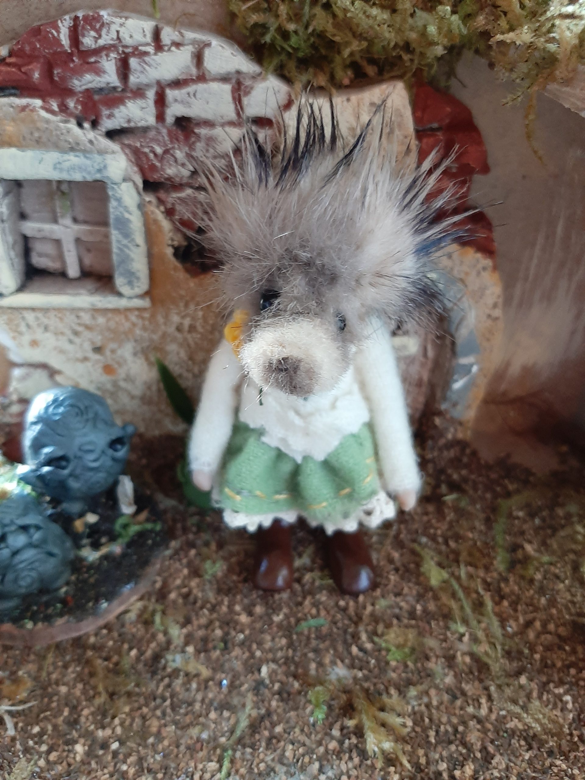 Hilary is approx 4 inches tall and is made from various materials including polymer clay and faux fur.