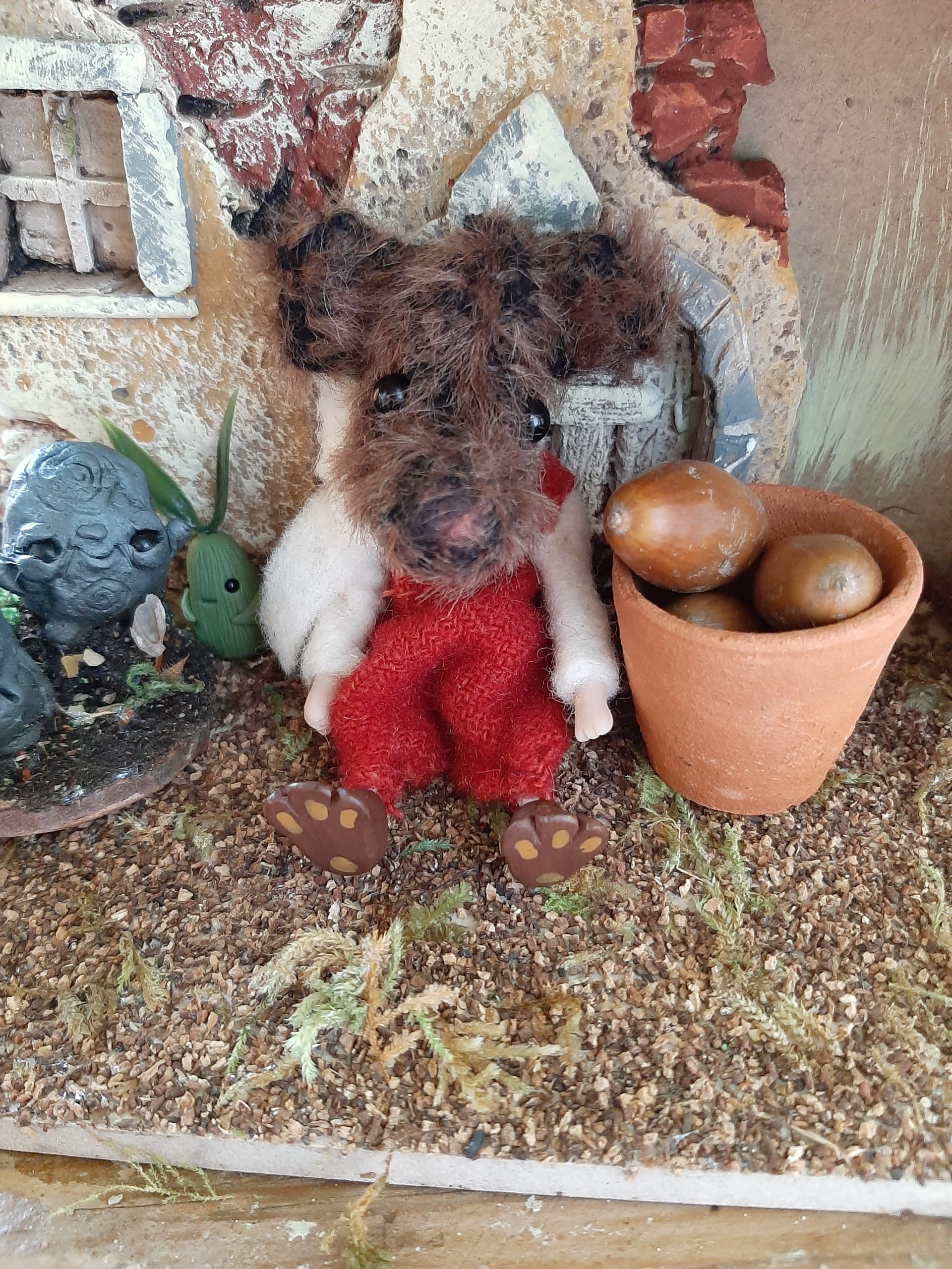 Muffin is approx 3 – 4 inches sat down and is made from various materials including polymer clay and faux fur