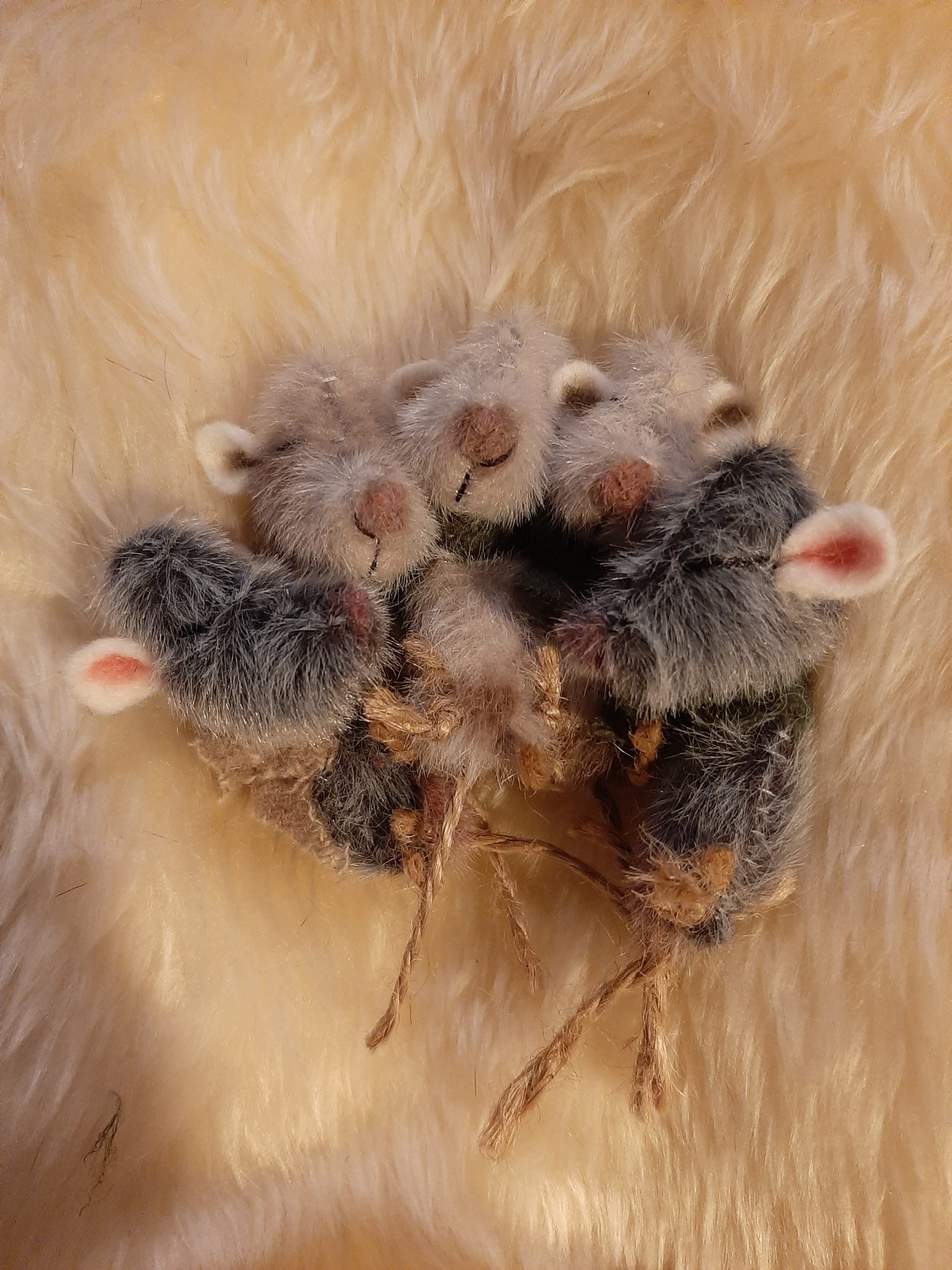 A huddle of 5 grey sleepy mice are looking for somewhere to get cosy!